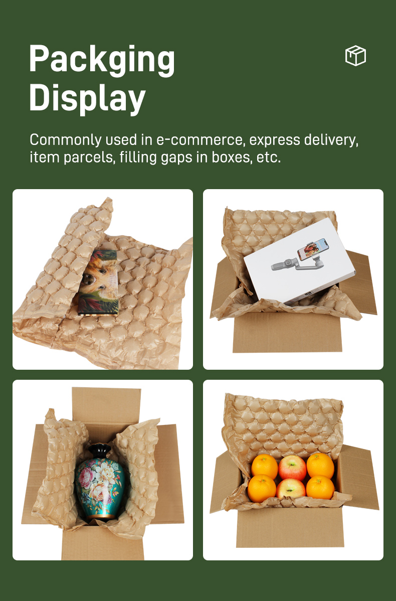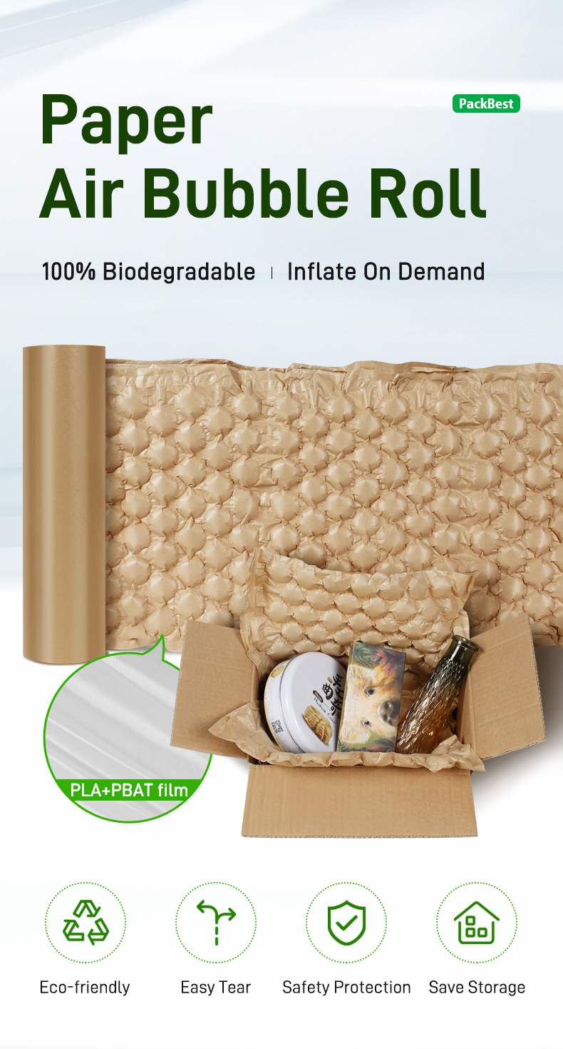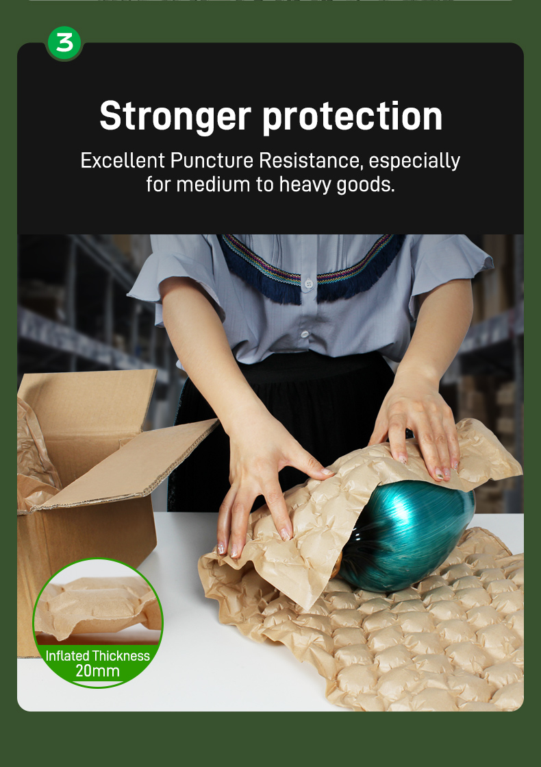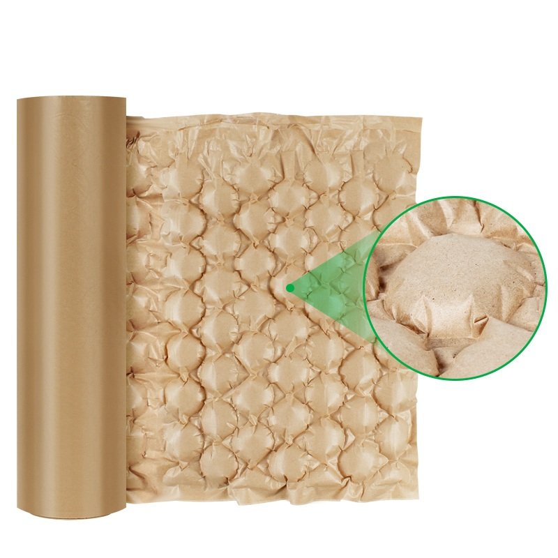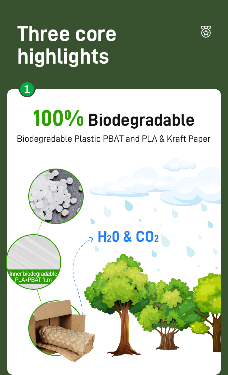 กระดาษกันกระแทกแบบถุงลม ผลิตจากวัสดุ ย่อยสลายได้ เป็นมิตรต่อสิ่งแวดล้อม โดยใช้กระดาษคราฟท์ผสมกับฟิล์ม PLA + PBAT ช่วยลดการใช้พลาสติกและไม่ก่อให้เกิดมลพิษต่อสิ่งแวดล้อม