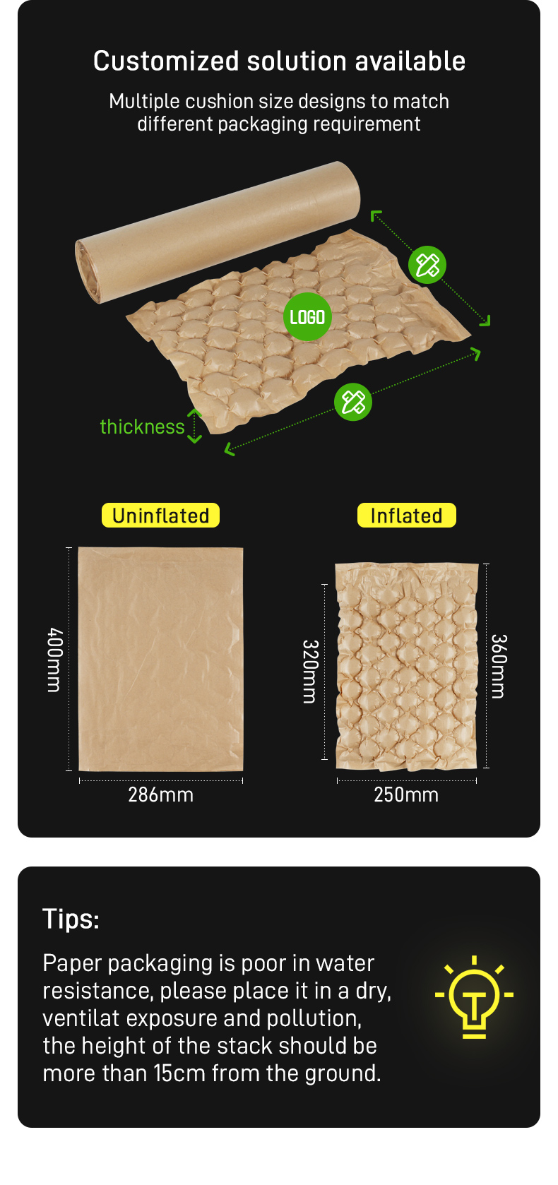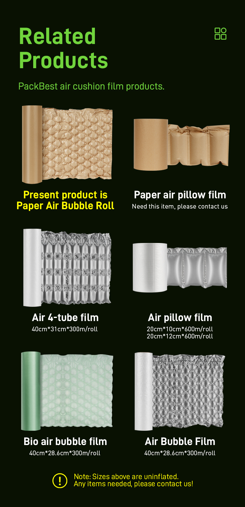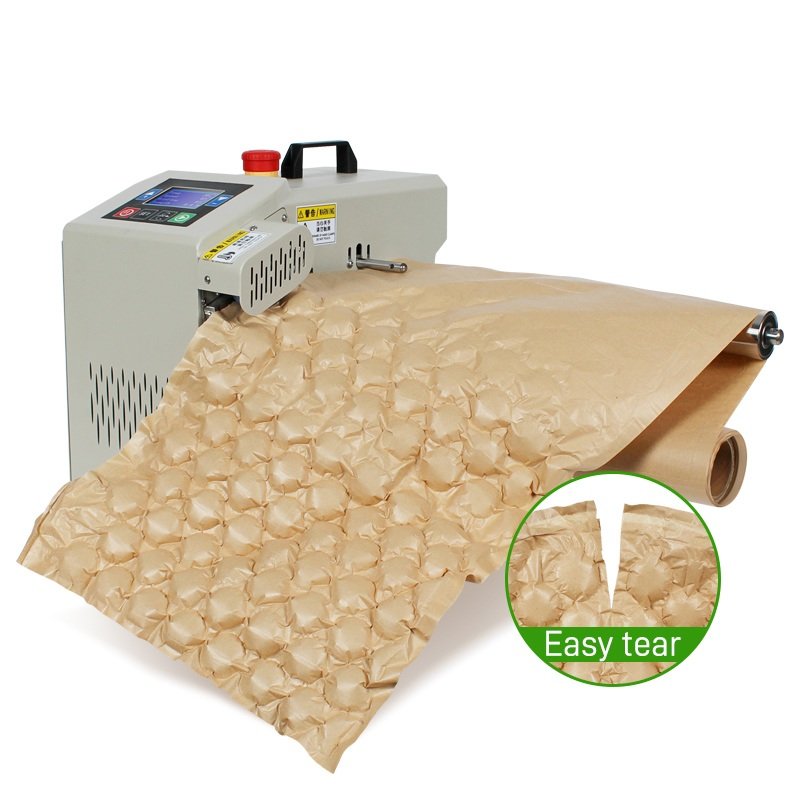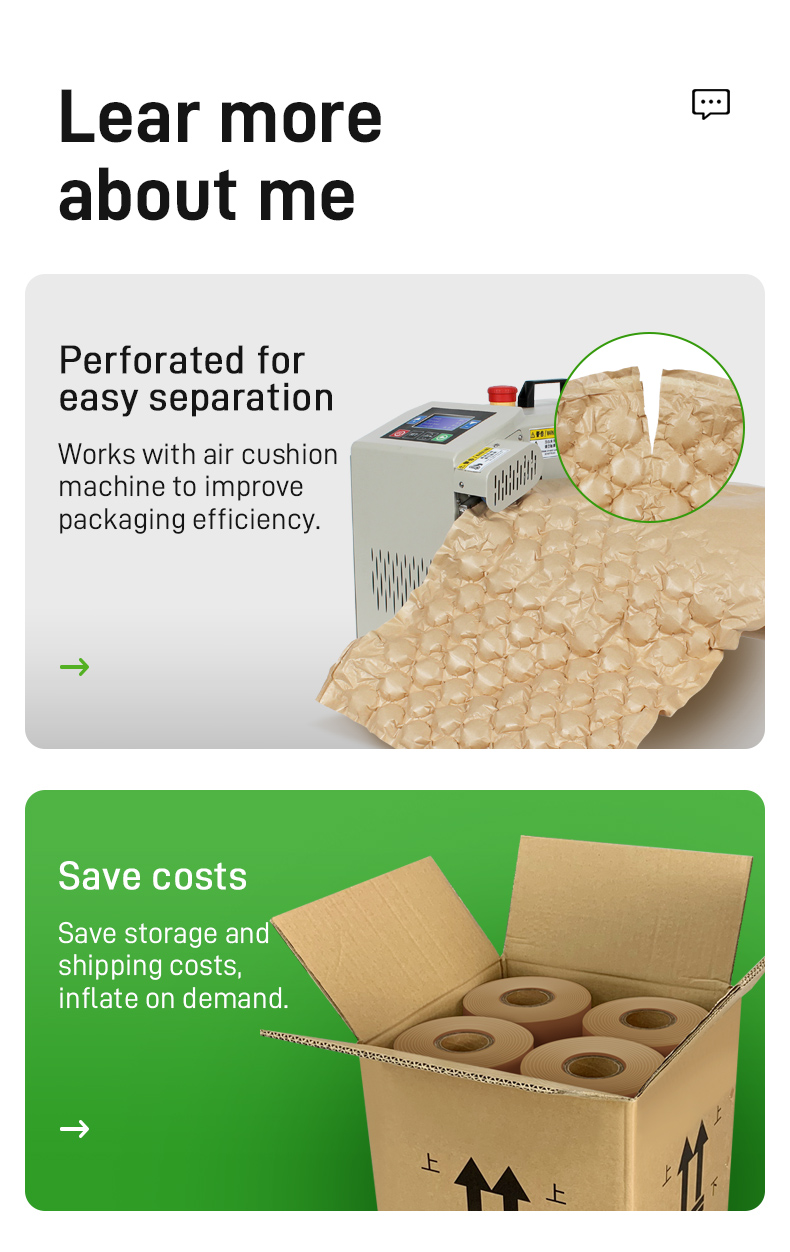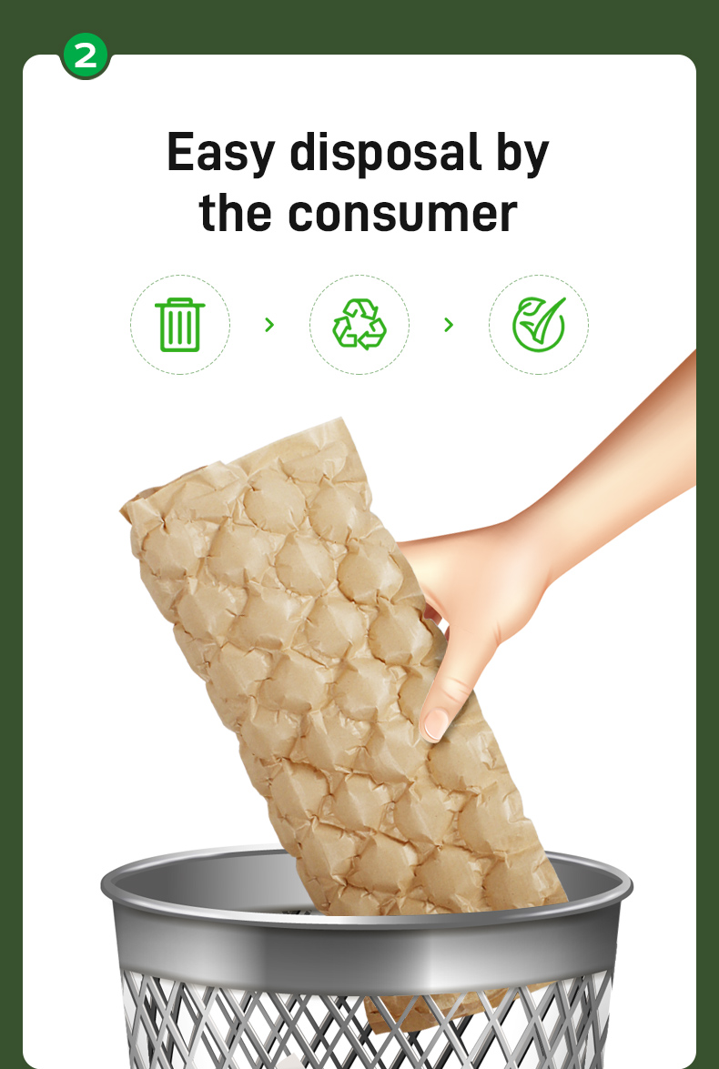 กระดาษกันกระแทกแบบถุงลม ผลิตจากวัสดุ ย่อยสลายได้ เป็นมิตรต่อสิ่งแวดล้อม โดยใช้กระดาษคราฟท์ผสมกับฟิล์ม PLA + PBAT ช่วยลดการใช้พลาสติกและไม่ก่อให้เกิดมลพิษต่อสิ่งแวดล้อม