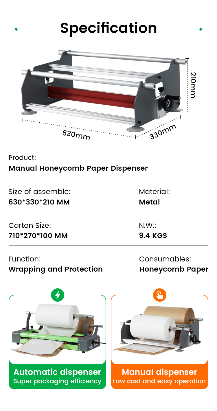 วัสดุ: โลหะ ขนาด: 630*330*210 มม. (หลังประกอบ) วัสดุสิ้นเปลือง: กระดาษรังผึ้ง ขนาดกล่อง: 710*270*100 มม. น้ำหนักสุทธิ: 9.4 กก. ฟังก์ชั่น: ห่อและป้องกัน